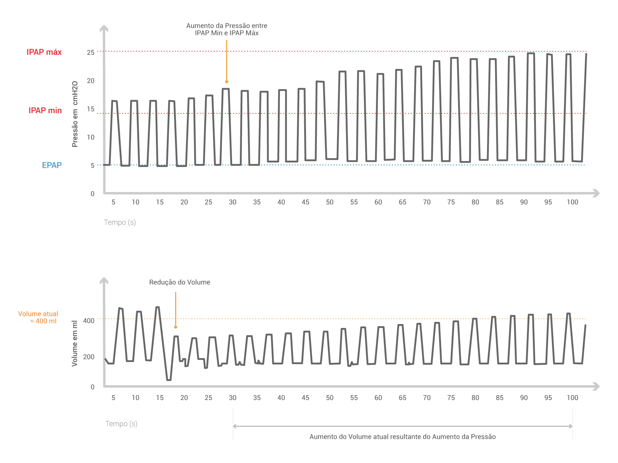 *Alguns modos com volume alvo permitem o ajuste automático da EPAP (auto-EPAP) com o objetivo de eliminar obstruções da via aérea superior, podendo ser uma opção para os doentes com instabilidade da via aérea superior.